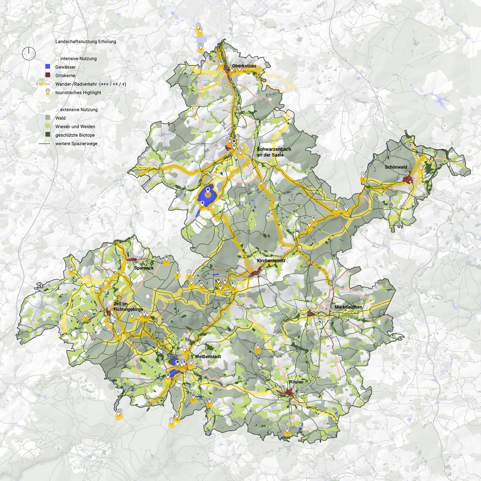 Die vergleichende Darstellung der Intensität der wirtschaftlichen Flächennutzung mit der Intensität der Erholungsnutzung verdeutlicht die Vielschichtigkeit und Multifunktionalität von Landschaft und Freiraum im NöFi. Diese Mehrfachkodierung kann Nutzungssynergien bilden – etwa im Bereich der Naherholung, Landwirtschaft und Energiegewinnung - führt aber auch zu Herausforderungen.