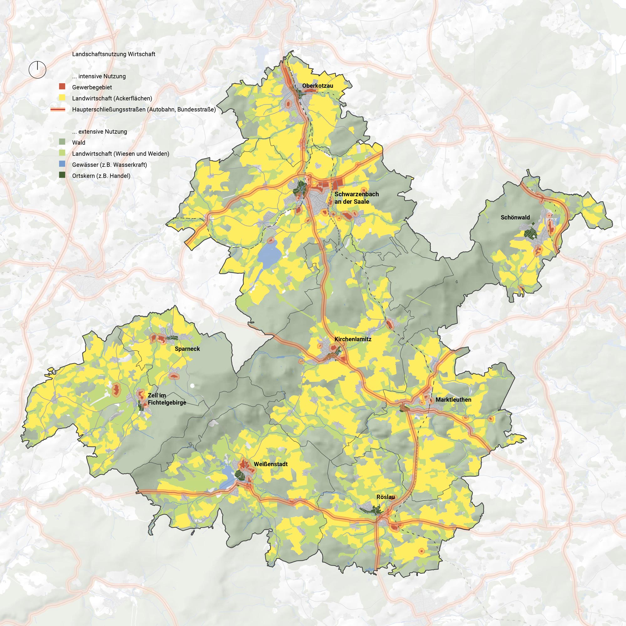 Die vergleichende Darstellung der Intensität der wirtschaftlichen Flächennutzung mit der Intensität der Erholungsnutzung verdeutlicht die Vielschichtigkeit und Multifunktionalität von Landschaft und Freiraum im NöFi. Diese Mehrfachkodierung kann Nutzungssynergien bilden – etwa im Bereich der Naherholung, Landwirtschaft und Energiegewinnung - führt aber auch zu Herausforderungen.