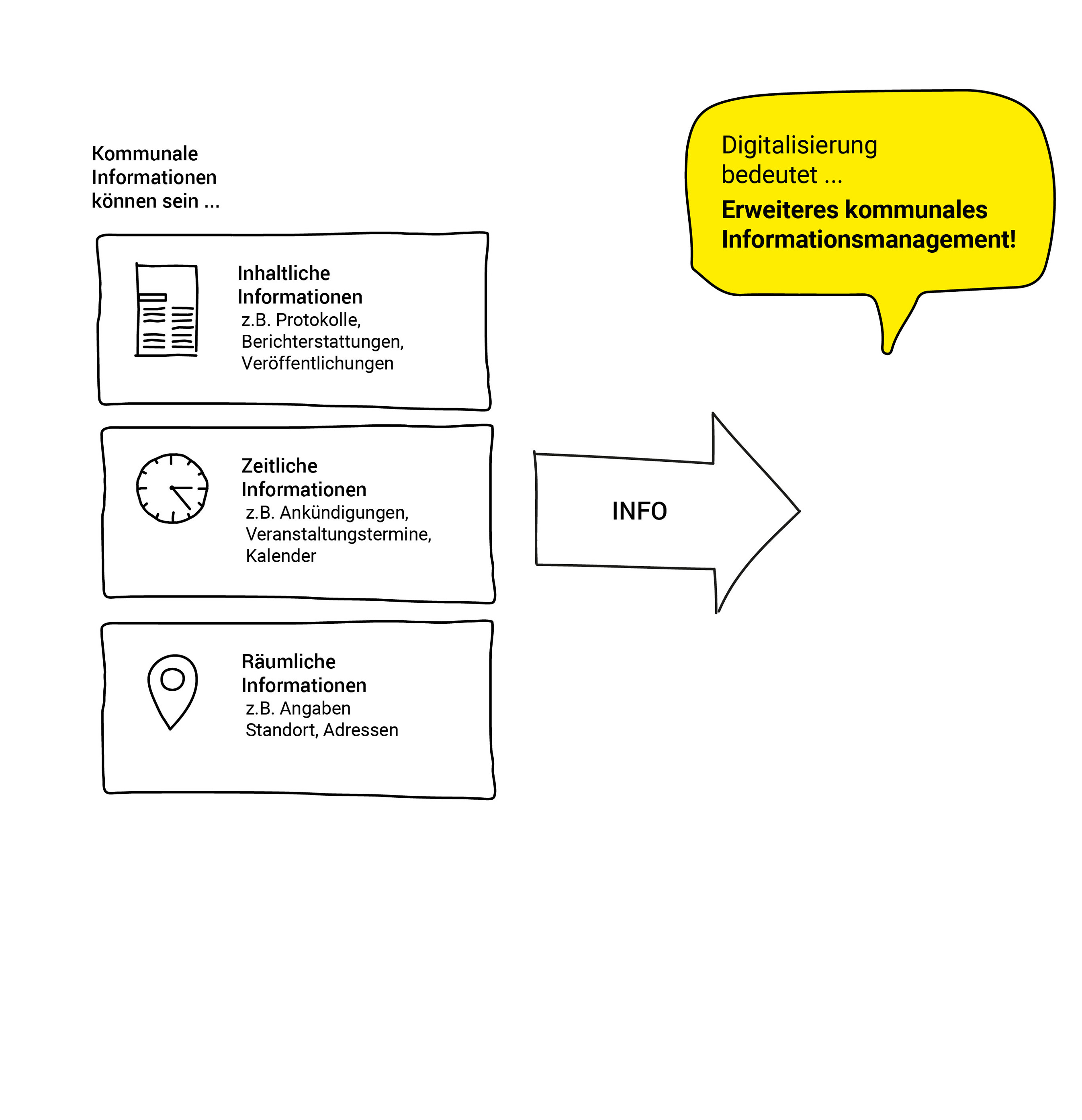 Informationen, von denen im Bereich des kommunalen Datenmanagements gesprochen wird, sind beispielsweise inhaltliche Informationen, wie Protokolle von Sitzungen, Berichterstattungen von Veranstaltungen oder Veröffentlichungen. Ebenso kann es sich um zeitliche Informationen handeln, beispielsweise Ankündigen von Terminen oder um räumliche Informationen, wie Angaben zu Standorten oder Adressen.