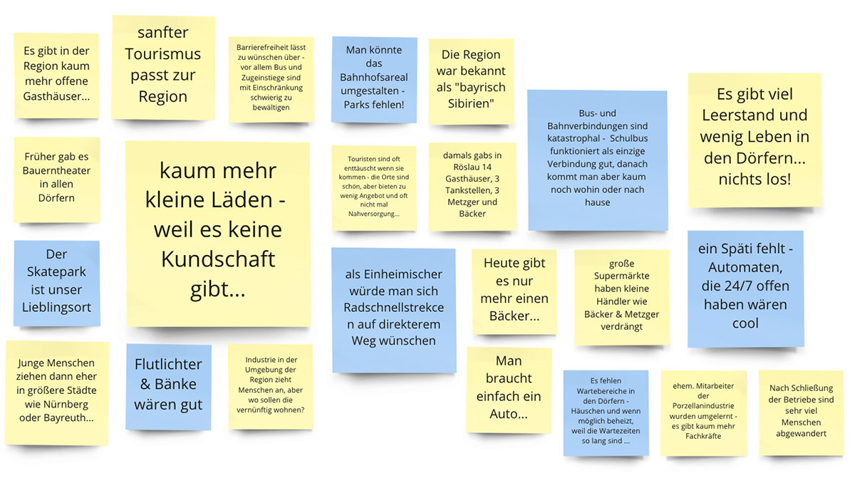 Im Rahmen des Projektes IDEK Nördliches Fichtelgebirge wollen wir die Bewohner*innen der Region sowohl auf digitalem, als auch auf analogem Wege am Entwicklungsprozess teilhaben lassen. In Workshops vor Ort konnten wir uns bereits mit verschiedenen Altersgruppen direkt austauschen.