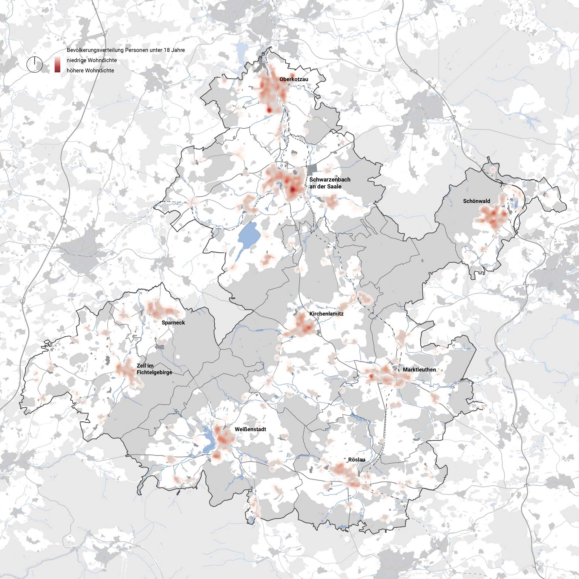 Der Darstellung des "Seniorengebirges" entsprechend, verdeutlicht auch die vergleichende Betrachtung der Bevölkerungsverteilung von Personen unter 18 Jahren mit Personen über 65 Jahren, dass im NöFi deutlich mehr ältere Menschen als jüngere wohnen. Die Karten visualisieren die Wohndichte, das heißt die Anzahl an Personen pro Hektar der jeweiligen Altersgruppe (Stand 2011), wobei die dunkelroten Bereiche die höchste Wohndichte verorten.