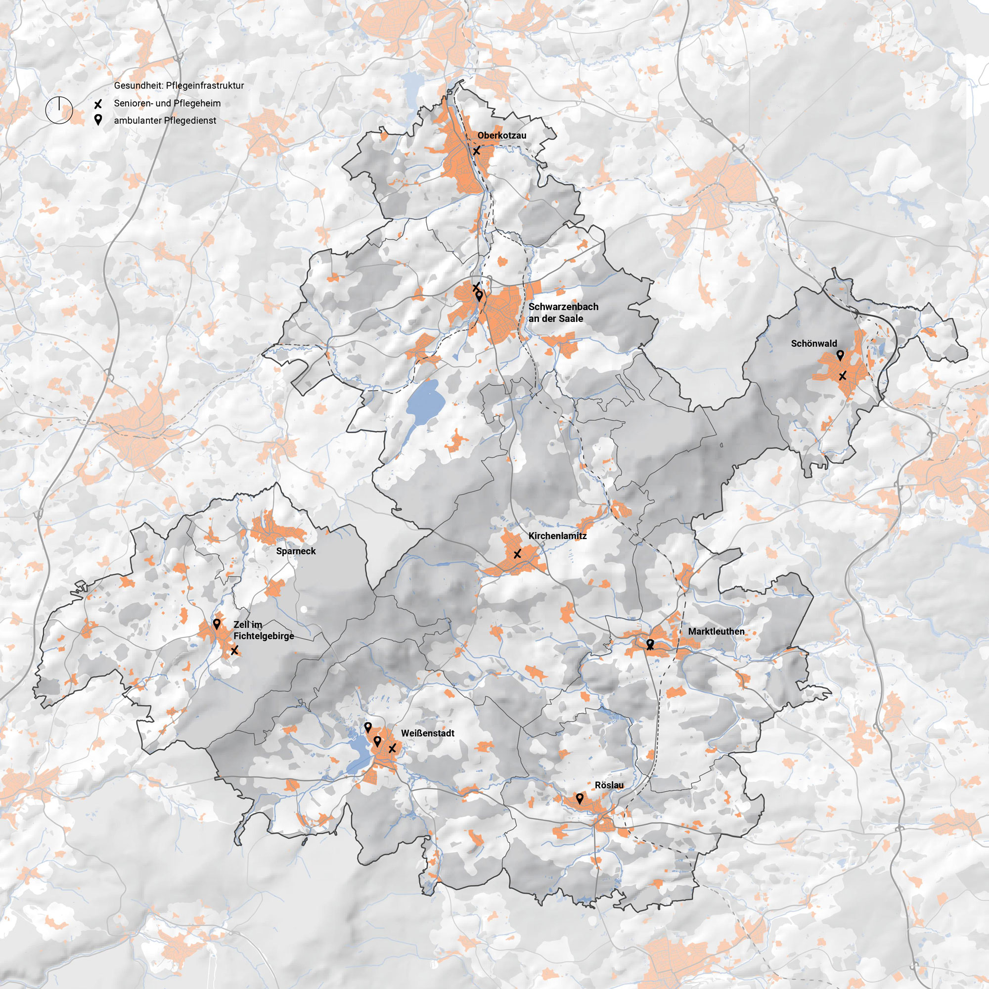 Leider gibt es in Resis Heimatort Sparneck, der in puncto Einwohner kleinsten Gemeinde im NöFi, kein Seniorenheim. In den meisten anderen Gemeinden ist das Angebot an Pflegheimen und an ambulanten Pflegeeinrichtungen gut ausgebaut. Weit umziehen müsste Resi also nicht. Die Karte verortet die Pflegeinfrastruktur im NöFi. Dargestellt sind Senioren- und Pflegeheime und ambulante Pflegedienste.
