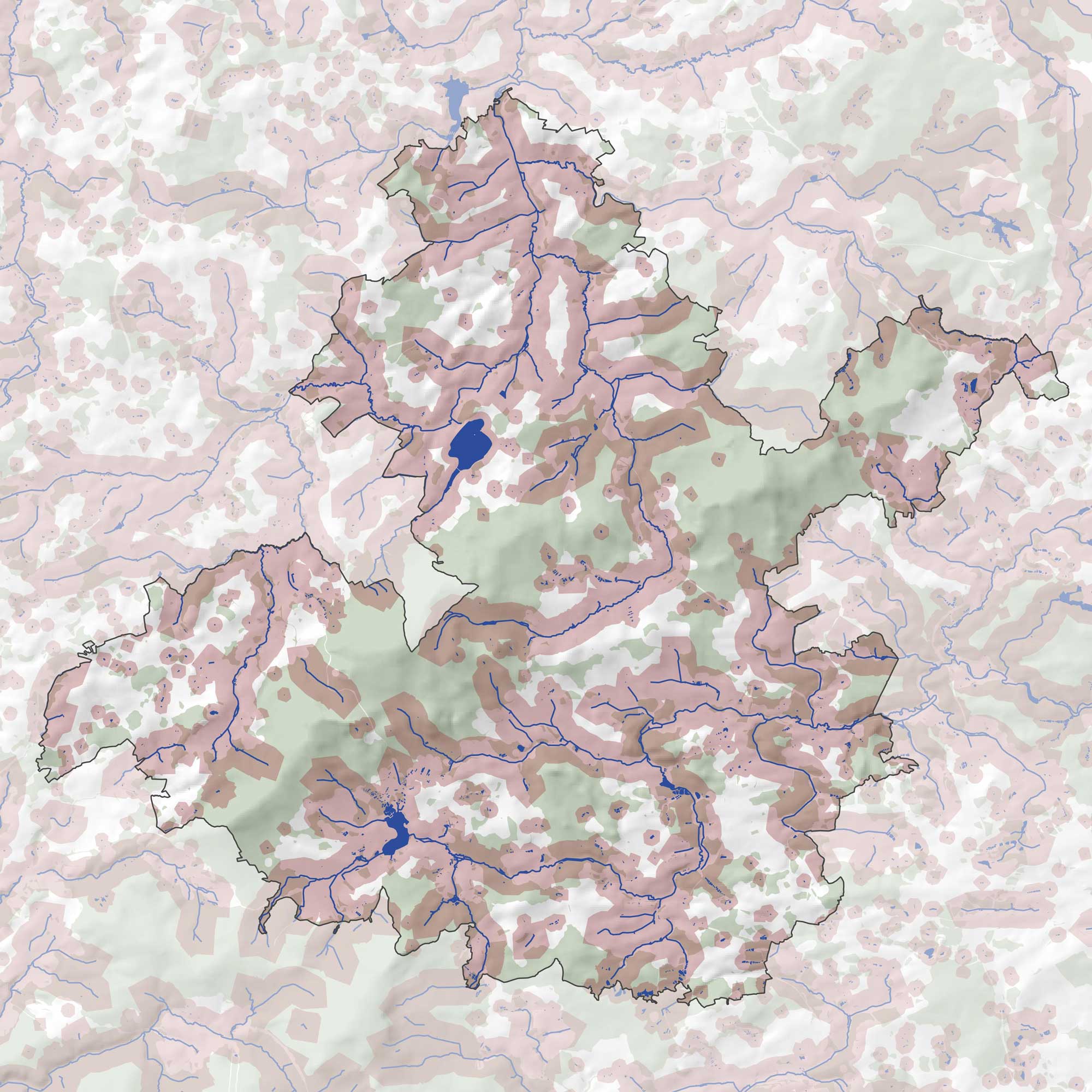 Die Karte zeigt die vielen Fluss- und Bachläufe sowie Weiher und Seen im NöFi. Die roten Bereiche sind maximal 200 Meter vom nächsten Gewässer entfernt. Abgesehen vom waldigen Höhenrücken des Fichtelgebirges ist das nächste Gewässer immer schnell zu erreichen.