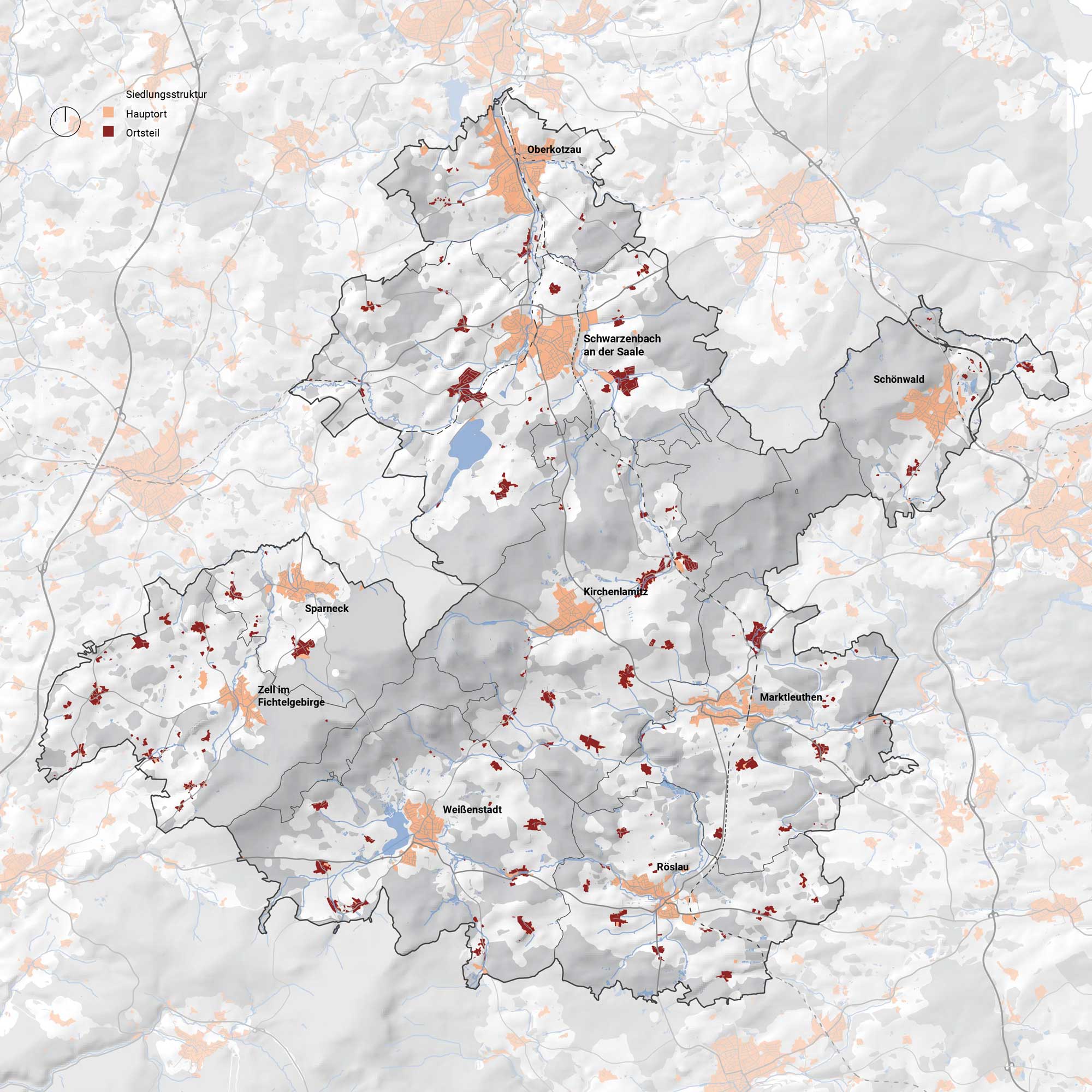 Betrachtet man das NöFi und seine Siedlungsstruktur genauer, fallen viele Gemeinsamkeiten der Kommunen auf. Besonders charakteristisch ist die Homogenität der Siedlungsstruktur: Alle Ortschaften haben einen historischen Kern, um den herum sich die Gemeinde entwickelt hat. Markant für die Region sind die in der Karte rot dargestellten Ansiedlungen an Höfen und Aussiedlerhöfe, die in ähnlichem Abstand zueinander über das gesamte NöFi verteilt sind. Die historisch gewachsene Kulturlandschaft, welche sich durch eine Vielzahl an sogenannten Rodungsdörfern charakterisiert, ist bis heute prägend.
