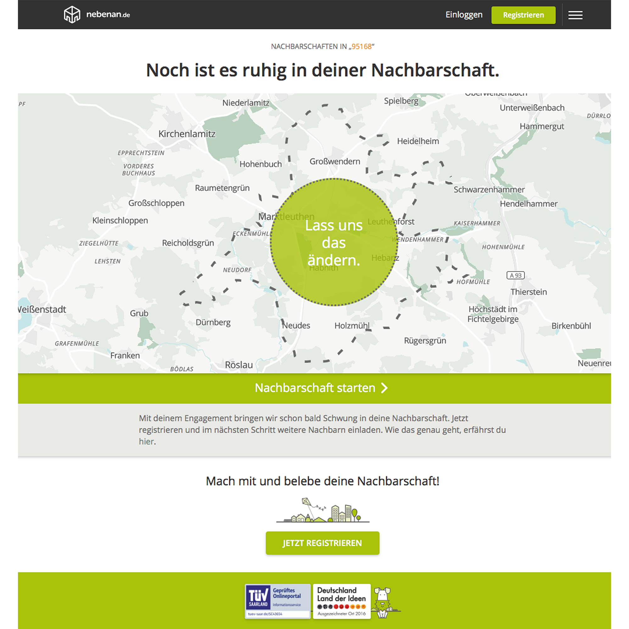Nachbarschaftshilfe "nebenan.de" - Screenshot der Website. https://nebenan.de/zip-code-area/95168. Zuletzt abgerufen: 10.09.2021