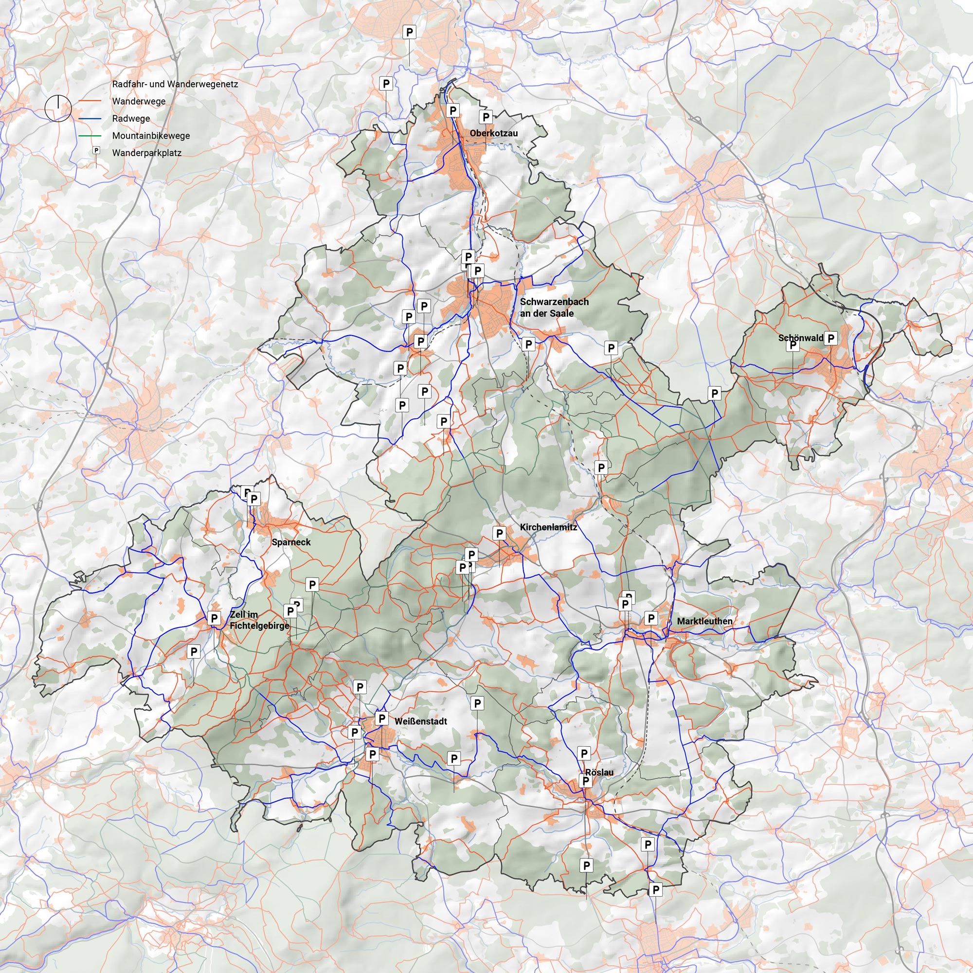 Das Freizeitwegenetz an ausgeschilderten Wander- und Radwegen im NöFi ist dicht, auch der Trendsport Mountainbiking ist im NöFi angekommen und es gibt einige Routen durch die Berge des Fichtelgebirge-Hufeisens. Mit dem eigenen PKW lassen sich zahlreiche Startpunkte gut erreichen, auch Wanderparkplätze gibt es ausreichend.