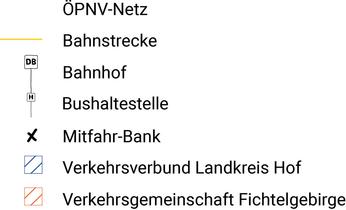 Verkehrsverbünde: Kartierung auf Basis von Informationen von https://www.vgf-web.de/fileadmin/user_upload/Fahrplan/LINIENNETZ_VGF_2021.pdf, https://www.landkreis-hof.de/file/2020/12/LINIENNETZ_LANDKREIS_HOF_2021.pdf sowie https://www.landkreis-wunsiedel.de/file/wabenplan.pdf