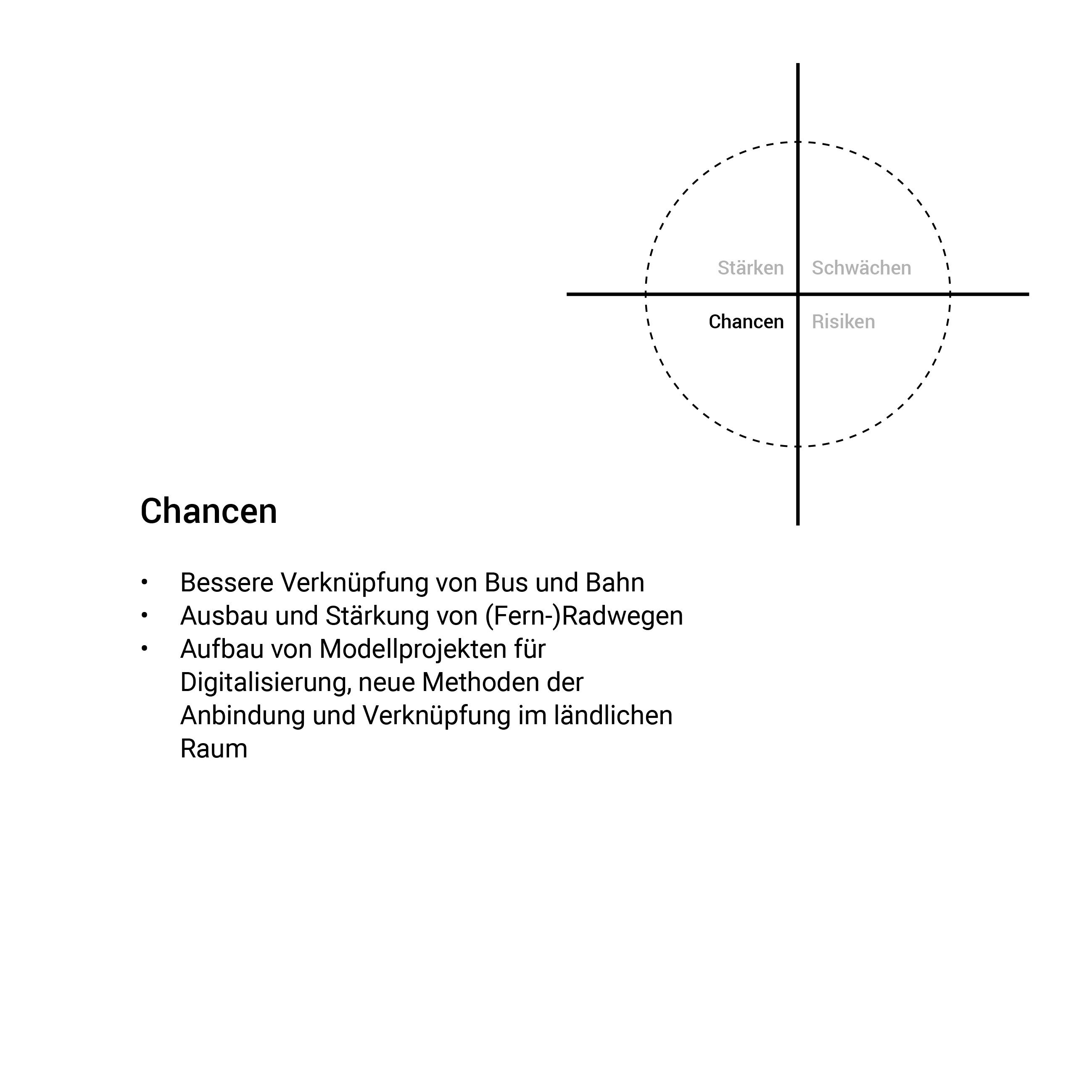 Es gilt, die Mobilität der Bewohner*innen vor allem unabhängig vom MIV zu stärken, für einen breiten Zugang zu gesellschaftlicher Teilhabe und Dienstleistungen: Gleichzeitig erlauben digitale Prozesse, dass Güter und Dienstleistungen ebenfalls mobiler werden und den Weg zu den Bewohner*innen finden. Diese vielschichtige Hypermobilität für Menschen und Güter/Services - sowohl innerhalb der Region als auch in angrenzende Städte - ist neben gemeinschaftlichen Sharing-Angeboten und digitalen Services eine große Chance für die Zukunft des NöFi.