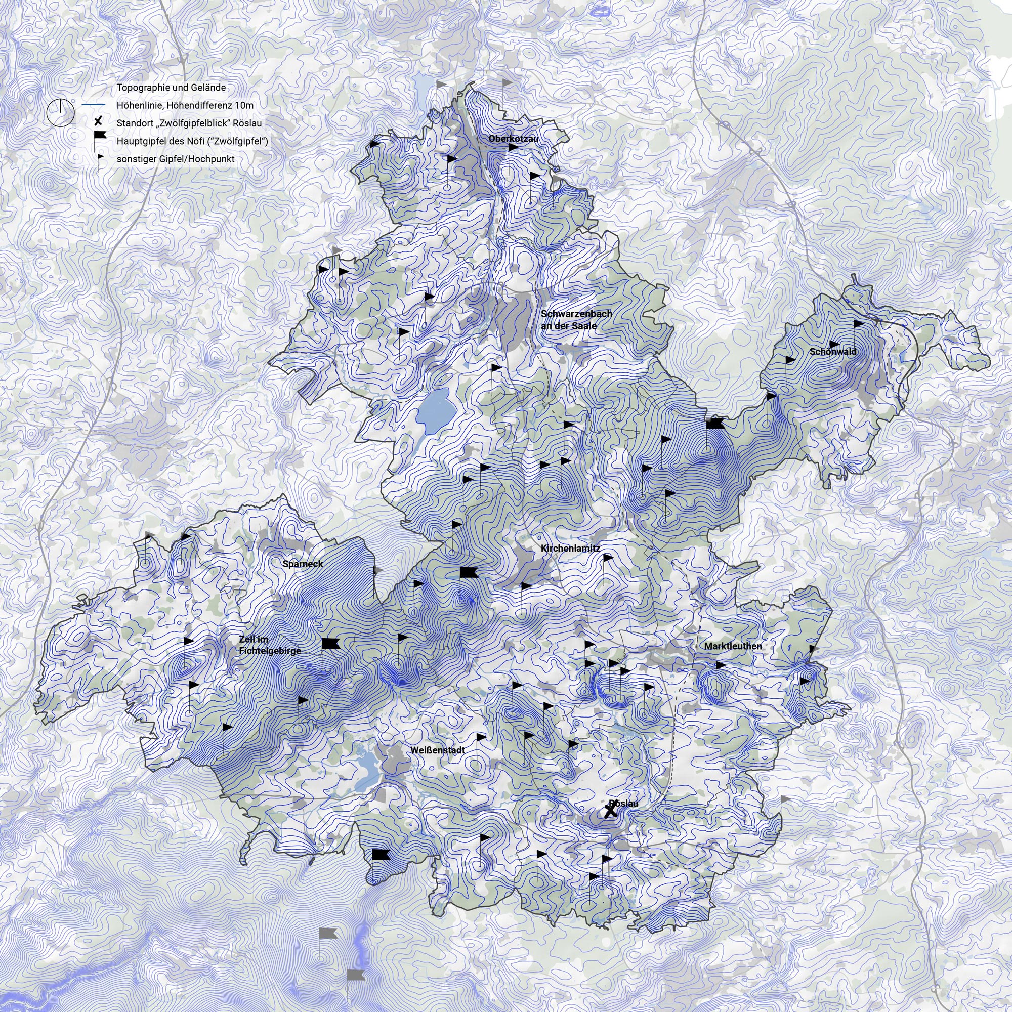 Hochpunkte: Eigene Kartierung auf Basis der Höhenlinien, sowie Berückschtigung der Gipfel des "12 Gipfel Blicks" (https://www.fichtelgebirge.net/fichtelgebirge/aussichtspunkte/12-gipfelblick-bei-roeslau)