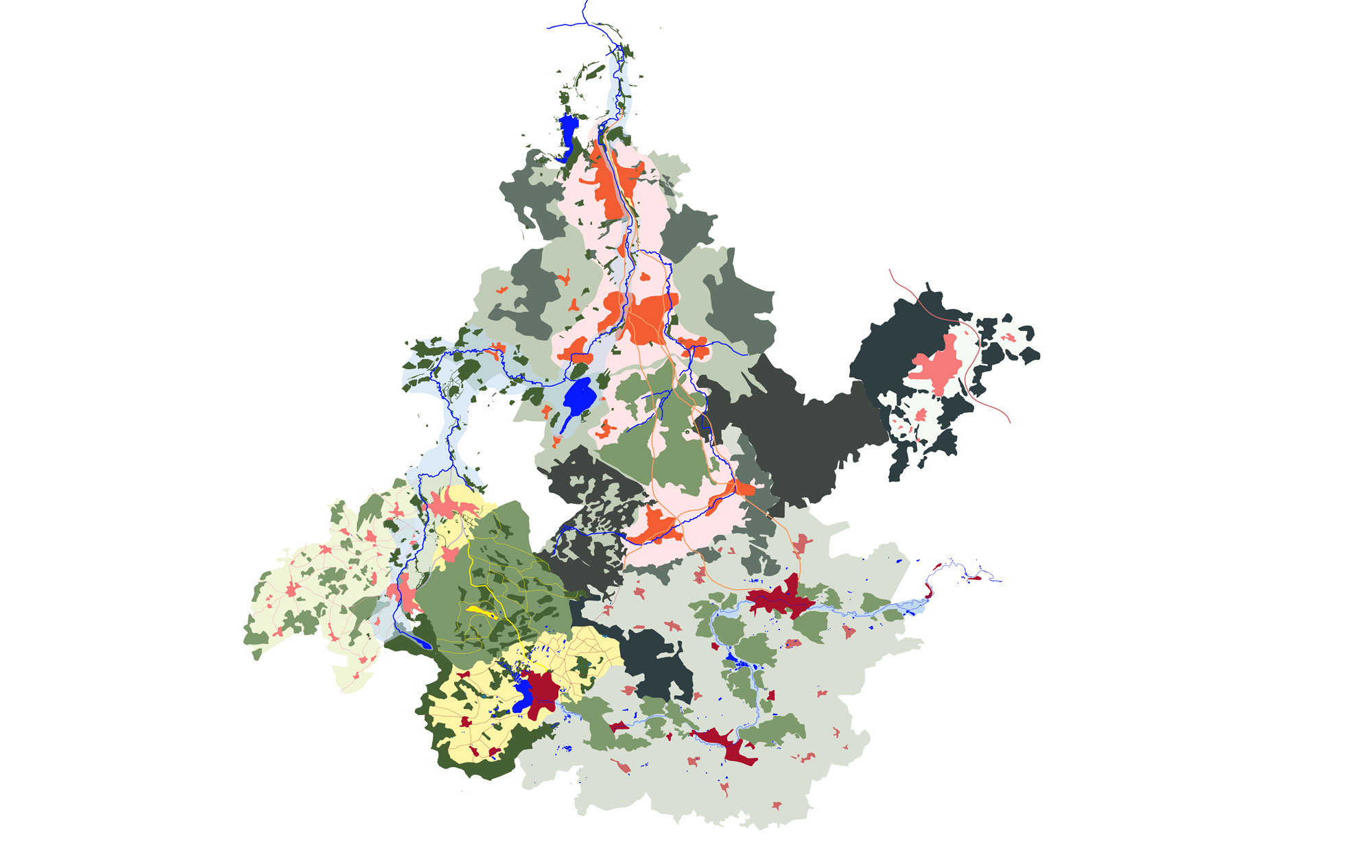 Um das NöFi in seinen spezifischen räumlichen Eigenarten und Funktionsweisen zu verstehen, wurde während der Analysephase ein erstes Raumbild gezeichnet. Raumbilder visualisieren räumliche Mechanismen, insbesondere hinsichtlich unterschiedlicher Morphologien, Funktionsweisen und teilräumlicher Zusammenhänge. Sie helfen somit die Vielschichtigkeit einer Region zu verstehen.