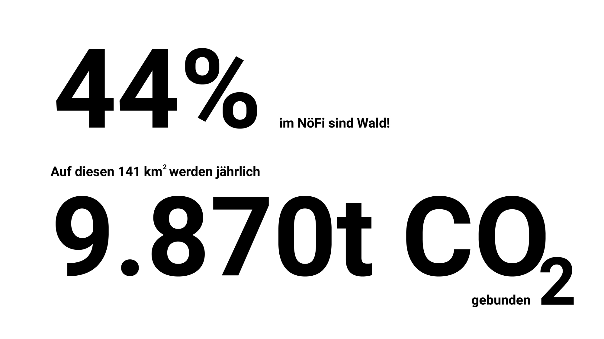 44 Prozent der Gesamtfläche des NöFis sind bewaldet. Auf diesen 141 Quadratkilometern Waldfläche werden jährlich fast 10.000 Tonnen CO2 gebunden. Der Wald hat somit neben seiner wirtschaftlichen Bedeutung und der Bedeutung für die Naherholung auch eine hohe Bedeutung für den Klimaschutz. Mithilfe des Waldes kann das NöFi zu einer klimaneutralen Region werden!