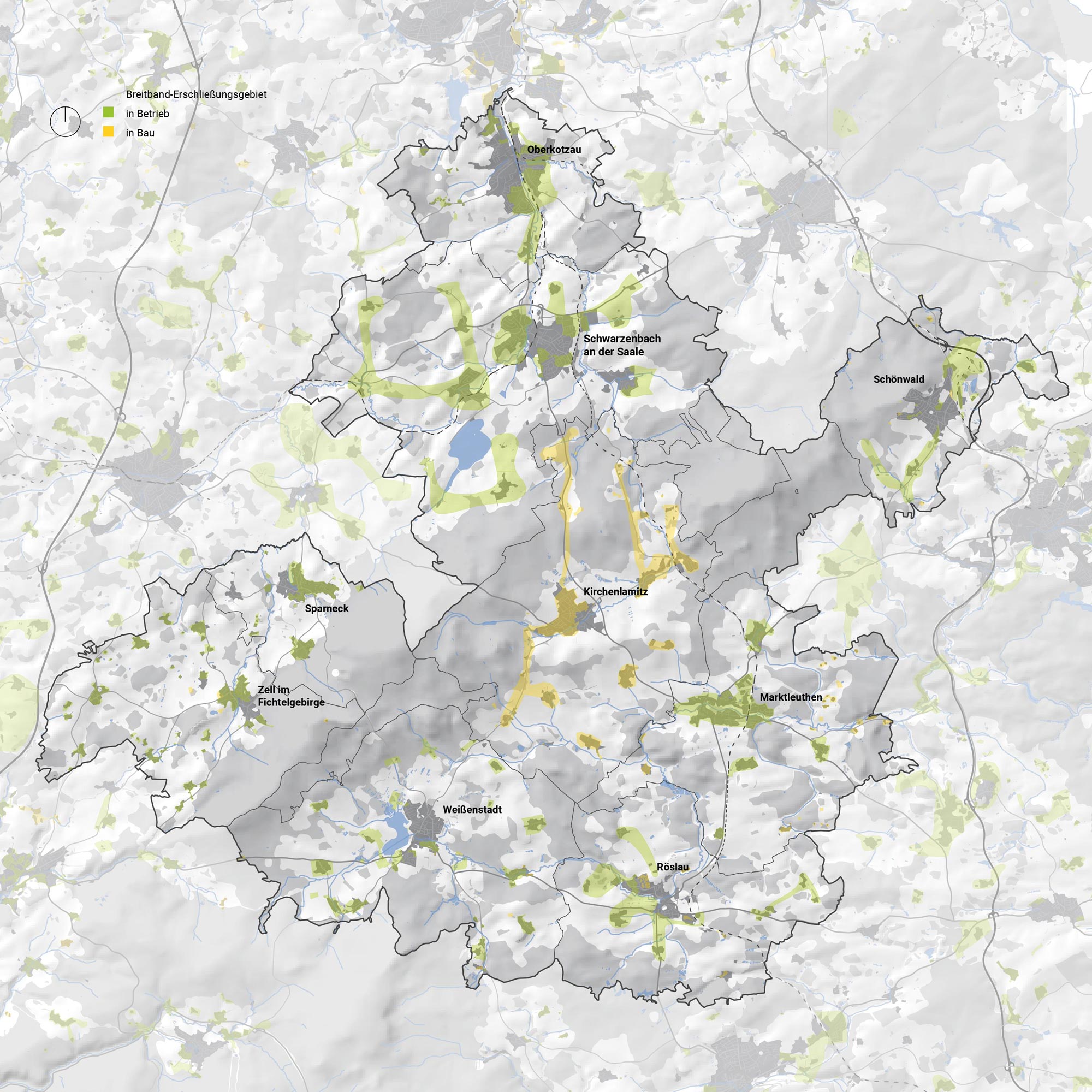 Heute ist das NöFi noch nicht flächendeckend mit Breitband sowie Mobilen Datennetzwerken abgedeckt. Der Ausbau schreitet aber zügig voran. Grün dargestellt sind die bereits betriebenen Breitband-Erschließungsgebiete. Die gelben Flächen verorten den Breitbandausbau im Bau.