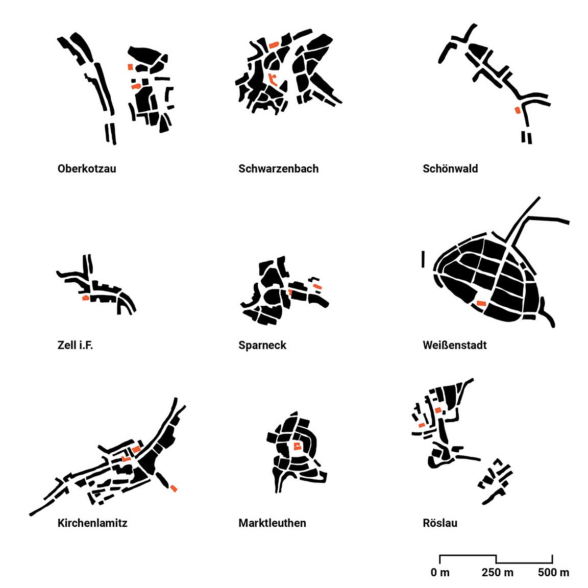 Während einige Zentren sich an den alten Hauptstraßen entlangziehen, sind andere als dicht bebaute kleine Städte radial um Kirchen und Rathäuser entstanden. Die Skizzen zeigen die Gebäude der historischen Zentren, rot hervorgehoben sind Rathäuser und Kirchen.