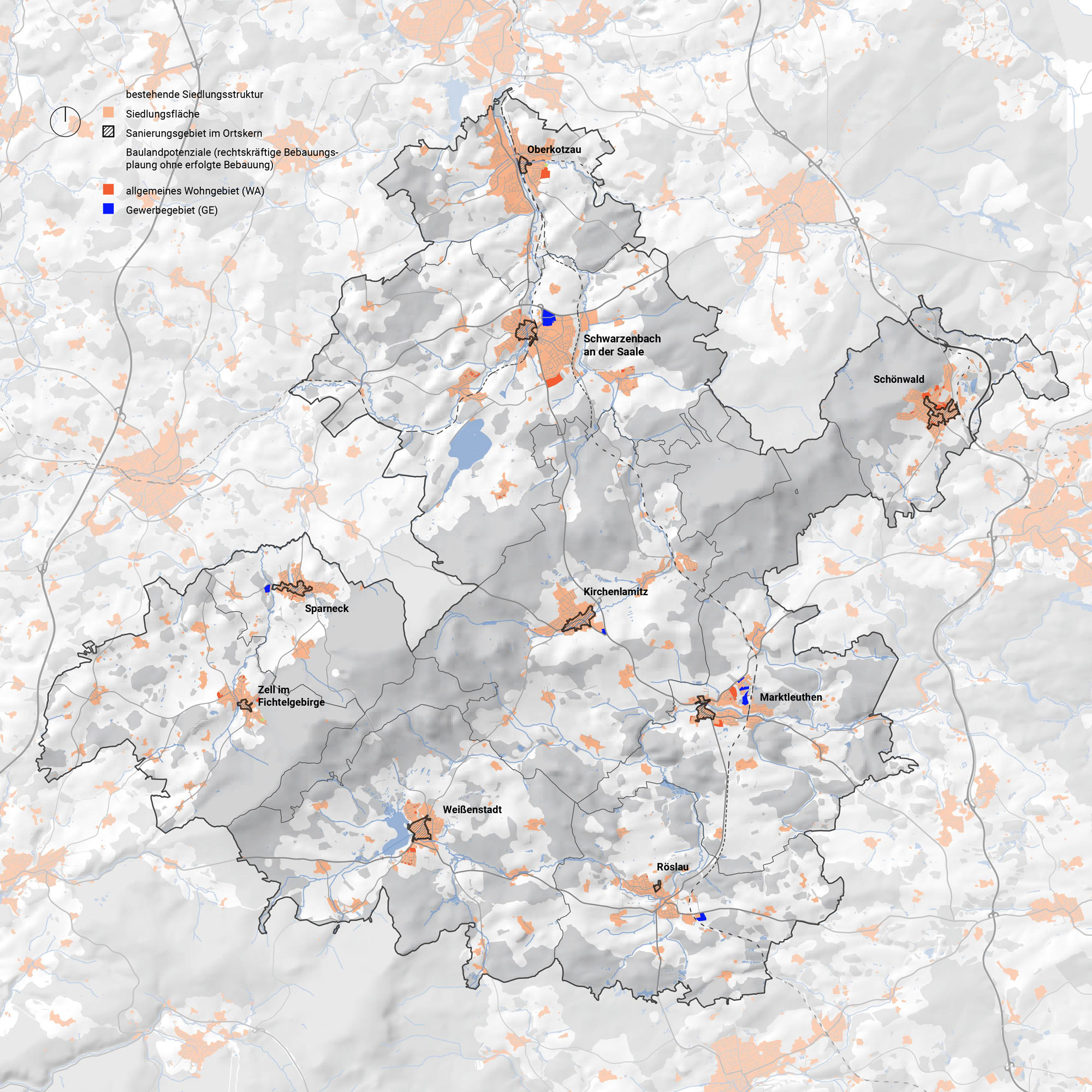 Baulandpotenziale: Kartierung der Flächen durch einen Abgleich bestehender Bebauungspläne (https://www.geoportal-hochfranken.de/) und einem aktuellen Luftbild.