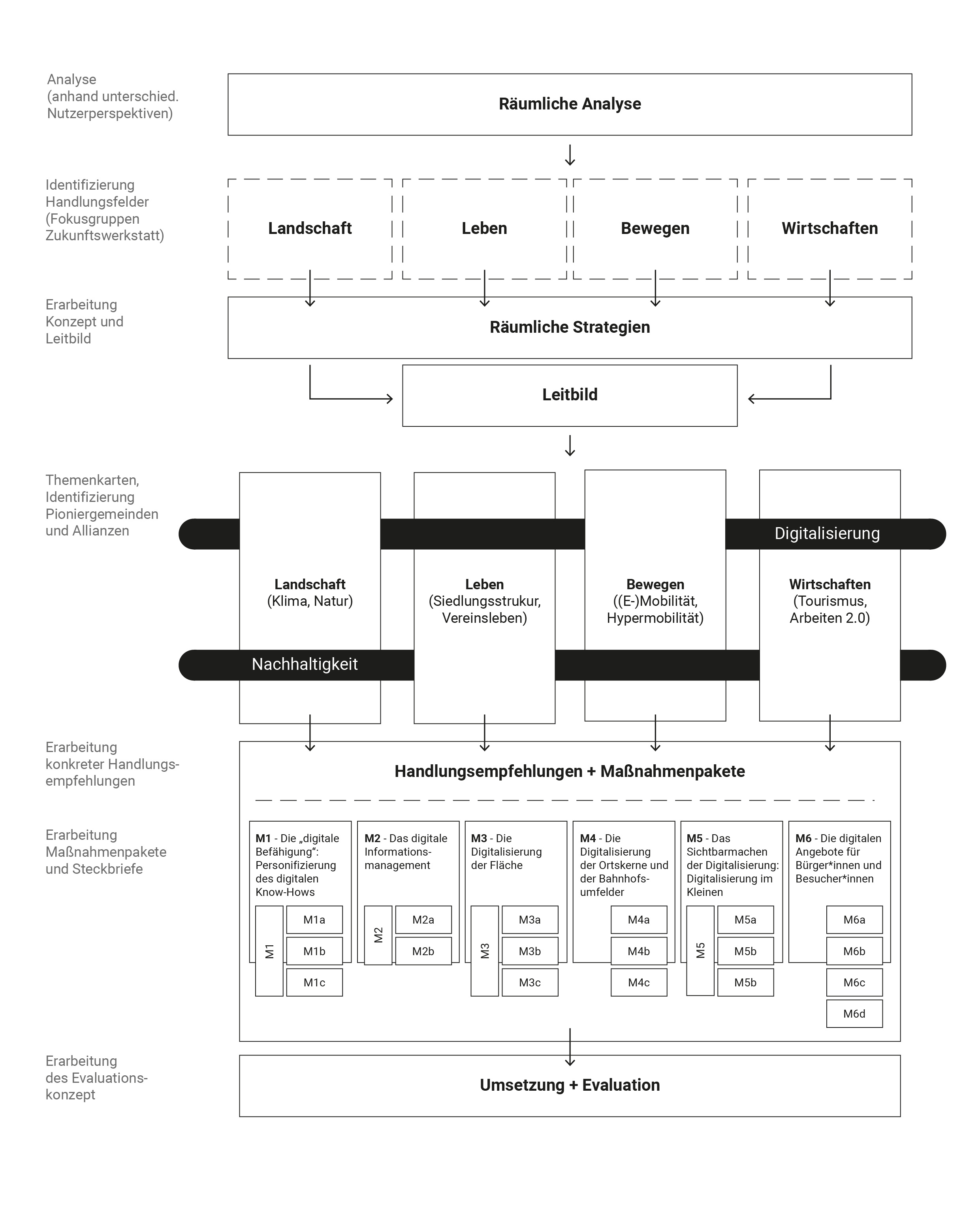 Ausgehend von der digitalen Potenzialanalyse und der Identifizierung projektorientierter Allianzen und Pioniergemeinden in den vier Handlungsfeldern „Landschaft“, „Leben“, „Bewegen“ und „Wirtschaften“ werden im Folgenden die vorgeschlagenen Maßnahmen ausgearbeitet und textlich beschrieben.