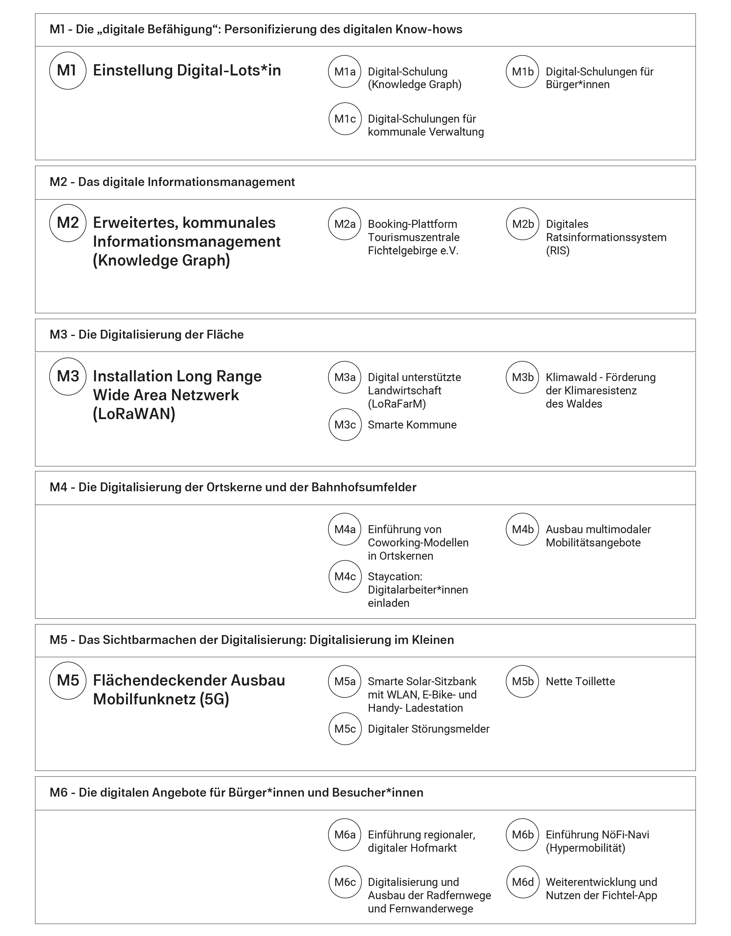 Die unter M1, M2, M3 und M5 beschriebenen Maßnahmen sind hierbei die Voraussetzung für die Umsetzbarkeit der jeweiligen Folgemaßnahmen. Die Maßnahme M1 bedingt exemplarisch die Maßnahmen M1a, M1b und M1c.